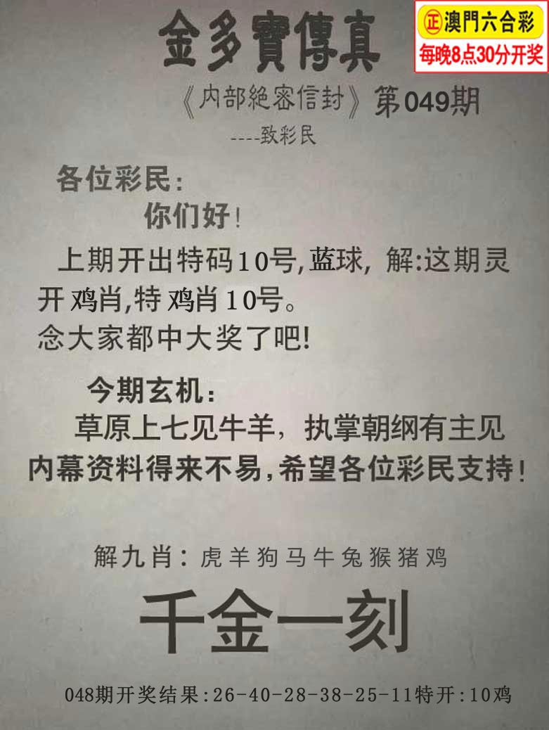 | 041期金多宝传真: 三字四字都是蓝,二门得九单数来 解:这句话可能是在描述某种具体的事物或情境,也有可能是在用特定的符号暗示某个规律或答案。 综合九肖:蛇牛马龙虎猪鸡狗猴 综合六肖:蛇牛马龙虎猪 主特12码:25 49 17 29 12 48 26 40 31 21 20 32 主特06码:25 49 17 29 12 48 |